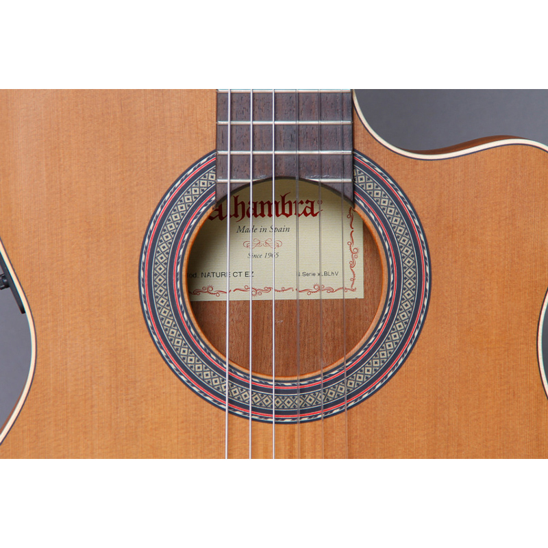 The guitar Z-Nature is an electro-classical guitar with cutaway and preamp which is very affordable. The steps of the manufacturing process have been reduced as well as its overall cost of production while keeping the recognized quality of Alhambra guitars. The Alhambra Z-Nature is completely made in Spain. With its natural satin finish, the pores of the Z-Nature remain open, allowing the sound to have a great resonance. The Z-Nature has a very simple design which boils down to its natural beauty. This guitar will bring beginners a safe choice and the opportunity to start with an instrument for perfect value for money.the pick up and preamp are the Fishman II with tuner.