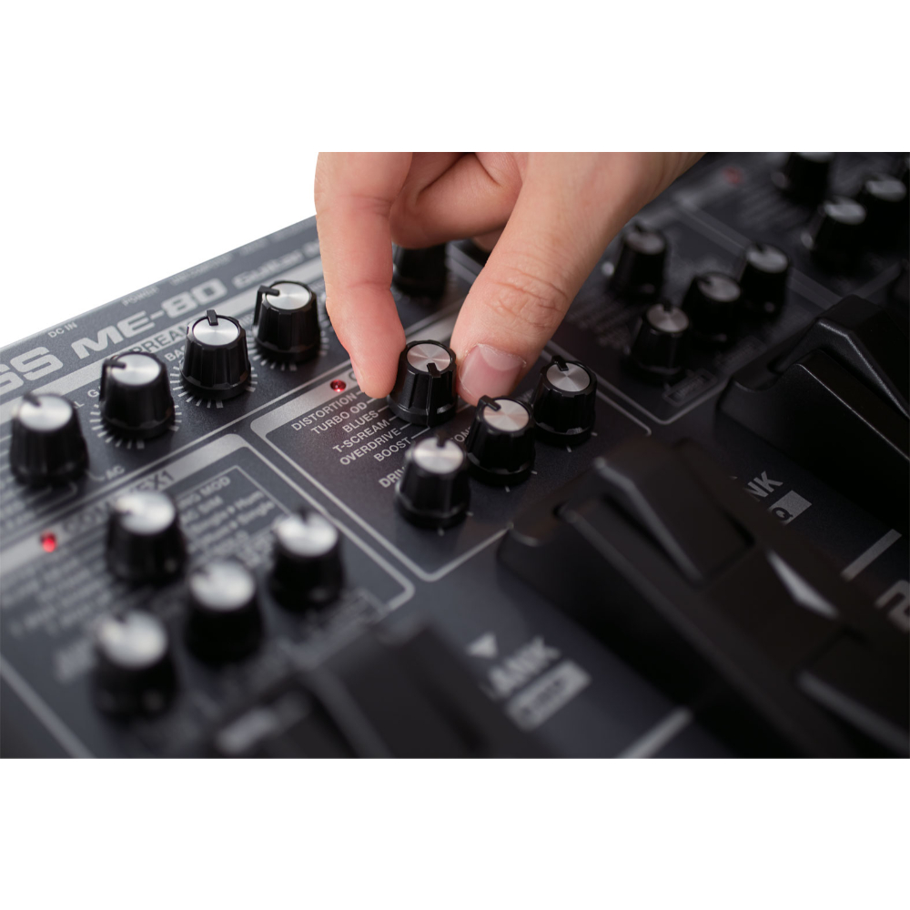 Mobile, battery powered, and filled with a diverse selection of flagship-quality BOSS amps and effects, the ME-80 is the ideal compact tone processor for performing guitarists. A friendly knob-based interface makes it simple to dial in great sounds in seconds, while easily selectable operation modes offer the flexibility of individual stompbox-style on/off or instant recall of complex multi-effects setups. Unique new footswitches deliver twice the control of previous designs for efficient and intuitive effects switching, patch selection, and real-time sound shaping while playing on stage. The free BOSS TONE STUDIO software unlocks even more tonal possibilities, providing a cool graphical interface for tweaking and organizing sounds on your computer, plus a web connection to BOSS TONE CENTRAL for direct access to free gig-ready patches created by top pro guitarists and much more.