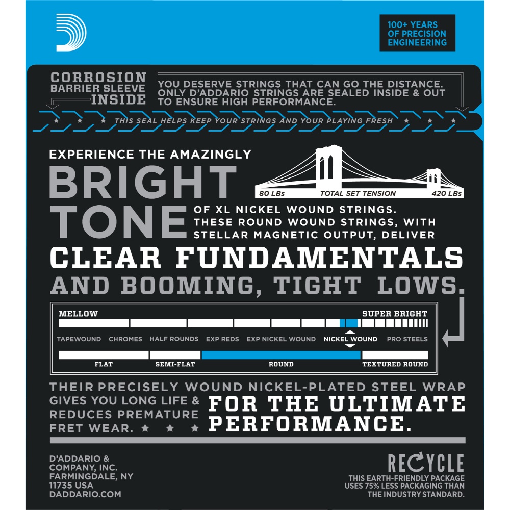D’Addario XL Nickel Wound Electric Bass strings are world-renowned as “The Player’s Choice” amongst bass players of all genres and styles. All XL strings are precision wound on our exclusive digitally-controlled machines, ensuring each string has excellent intonation, clear fundamentals, and unparalleled consistency. Each string is wound with a nickelplated steel wrap wire known for distinctive bright tone with excellent magnetic output delivering a universally appealing and versatile tone for all playing styles./p