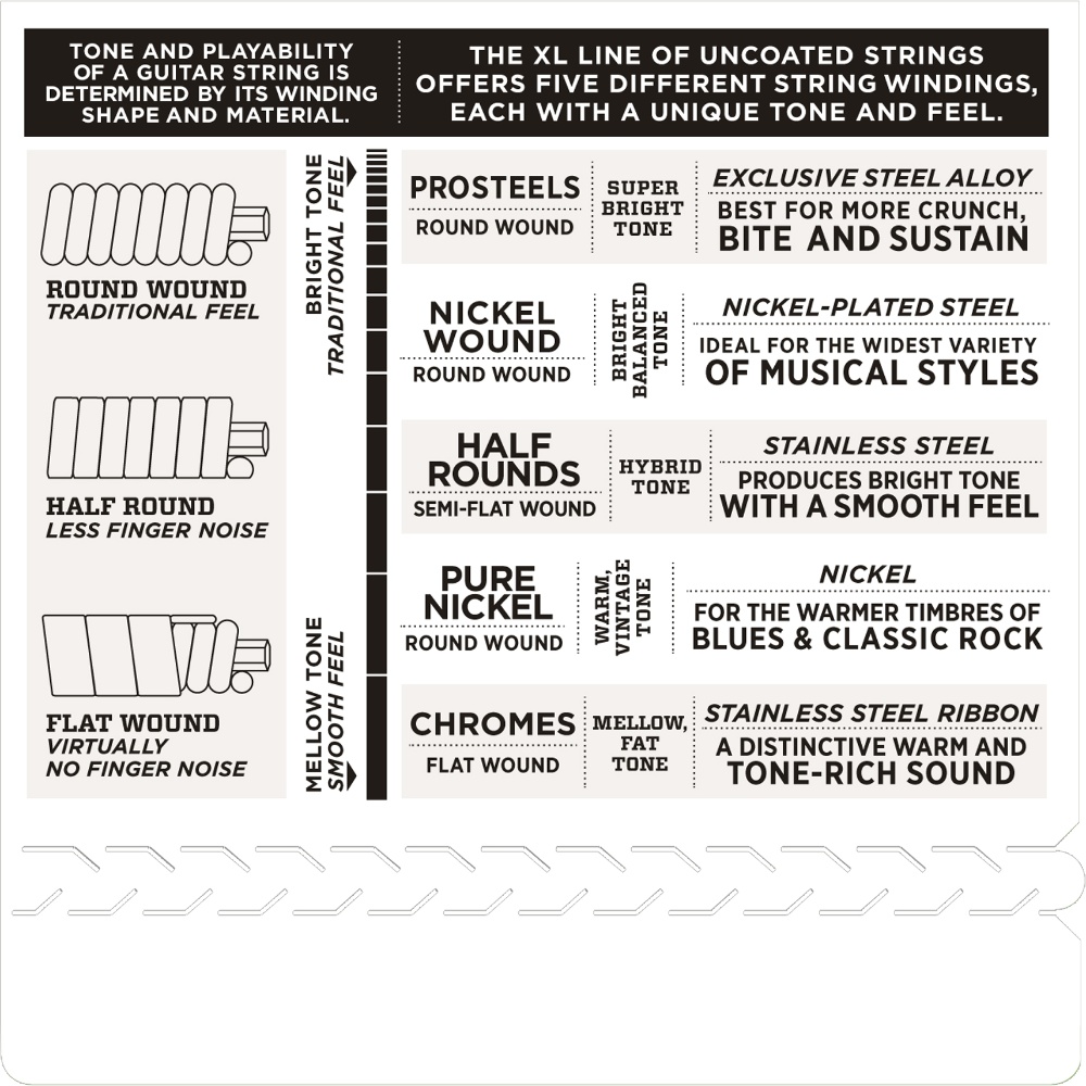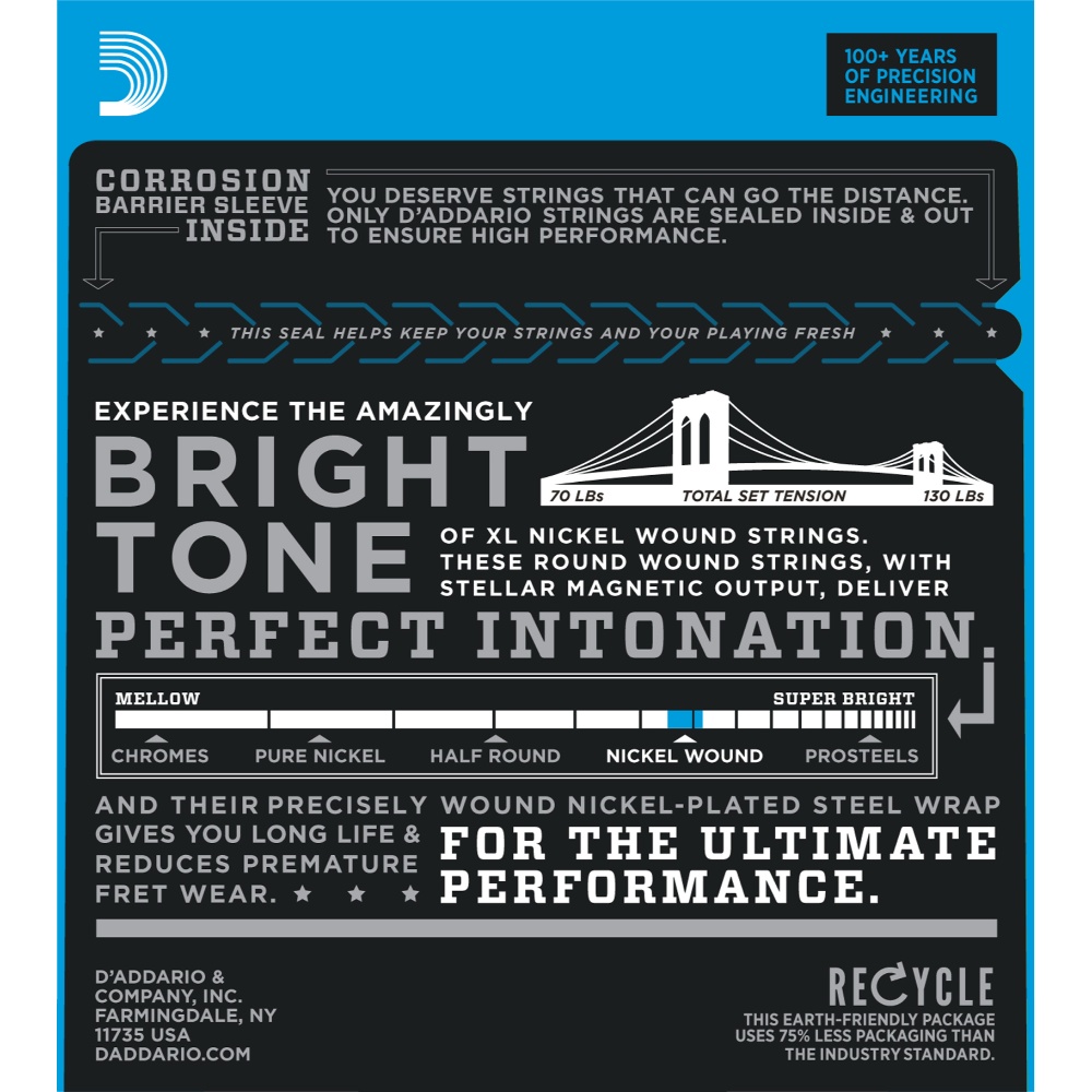 XL Nickel Wound, D’Addario’s most popular electric guitar strings, are precision wound with nickelplated steel onto a carefully drawn, hexagonally shaped, high carbon steel core. The result, strings with long lasting, distinctive bright tone and excellent intonation, is ideal for the widest variety of guitars and musical styles./p