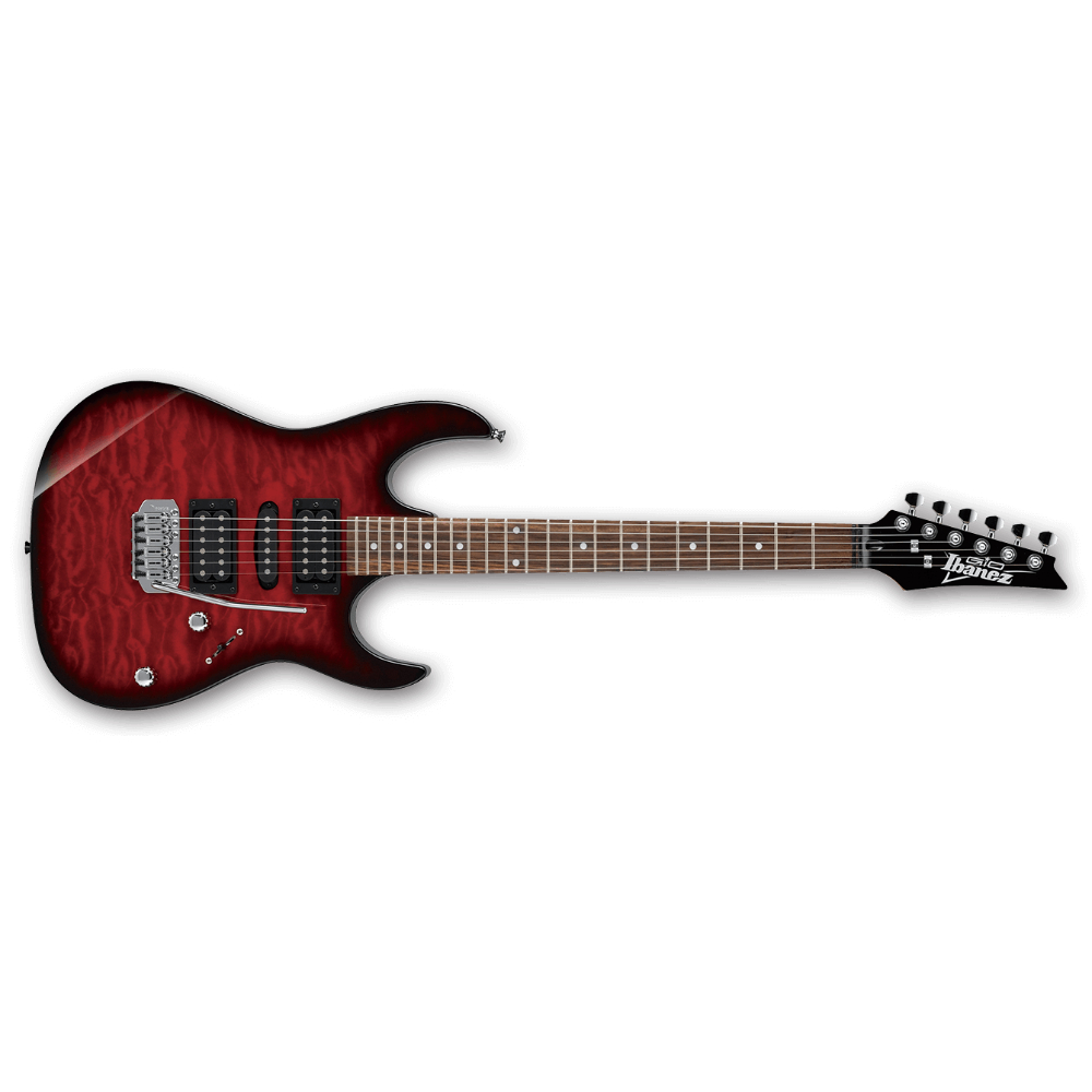 The GRX70QA is an RX series solid body electric guitar model and features a basswood body with an art grain simulated quilted maple veneer bolted to a maple neck with a 22-fret rosewood fingerboard with dot position markers. Components include Ibanez pickups with two humbuckers flanking a single-coil and a synchronized tremolo bridge.